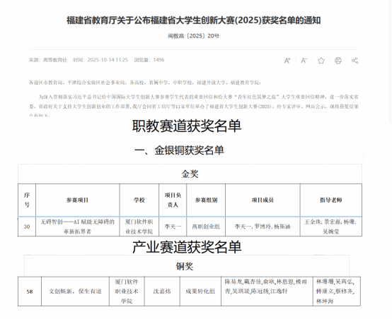 “无碍智创——AI赋能无障碍的革新拓界者”项目首次征战省赛便一举夺金,实现学校在福建省大学生创新大赛中金奖“零的突破”。项目由软件工程学院李天一担任队长,经济管理学院罗博玲、杨斯涵为核心队员,在王金珠、景宏磊、杨珊、吴婉莹四位老师的指导下,聚焦聋哑群体 “发声”沟通障碍等难题,依托学校专业群的技术积累,用国产AI技术搭建起沟通桥梁。项目团队从技术研发到方案优化,反复打磨产品细节,通过厦门市大学生创新创业大赛和海峡两岸女大学生创新创业大赛等各类赛事的历练,最终凭借扎实的技术实力、精彩的现场路演和鲜明的社会价值,一举夺得职教赛道创业组金奖,相关指导老师同时获评“福建省优秀创新创业导师”称号。展望未来,本项目将提交申请2项实用新型专利与1项软件著作权,在做好知识产权保护的同时持续做好项目落地实施。同时,本项目拟联合厦门市残疾人联合会、特殊教育学校共建 “无障碍技术服务中心”,让创新成果从“赛场”走向“生活”,切实惠及特殊群体,用科技传递教育温度。